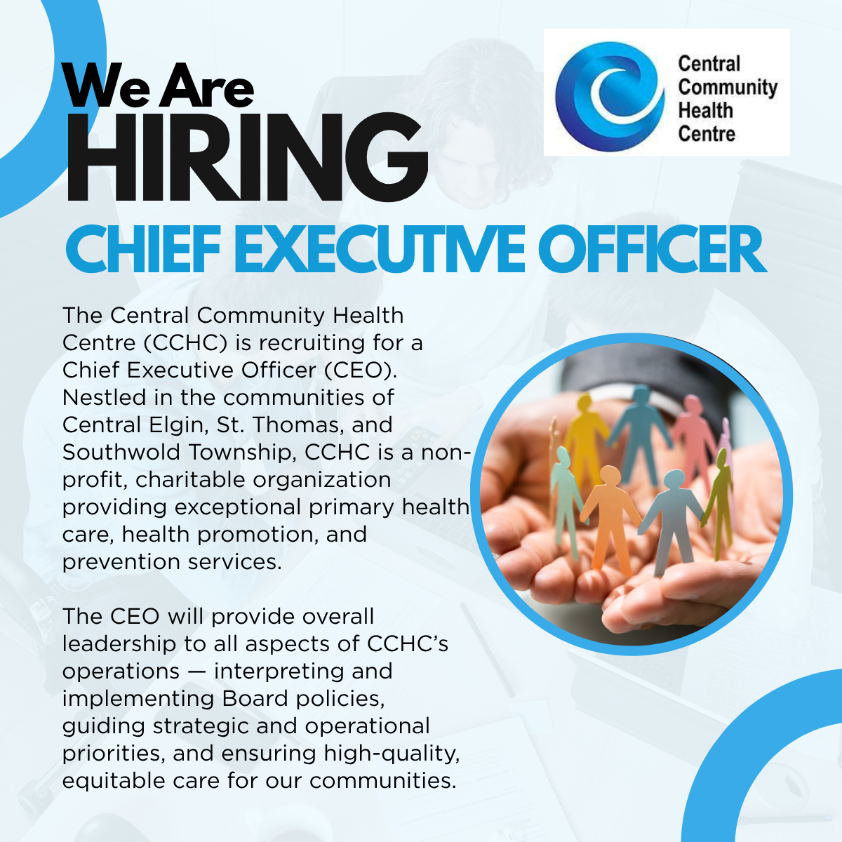 Central Community Health Centre (CCHC) is a non-profit, charitable, community governed organization. Our interprofessional team provides primary health care, health promotion and prevention programs and services to residents of Central Elgin, St. Thomas and Southwold Township.