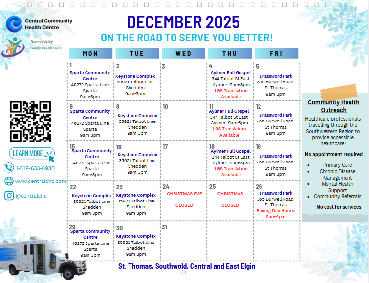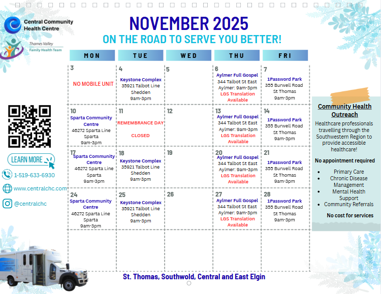We offer access to a nurse practitioner, nurses, and community paramedics to ensure client’s have a wide range of access to healthcare support services. We offer primary care, chronic disease management, mental health support, and help navigating community support services. All appointments are walk-in, no appointments, no referrals needed, and no cost for service. We look forward to meeting you!